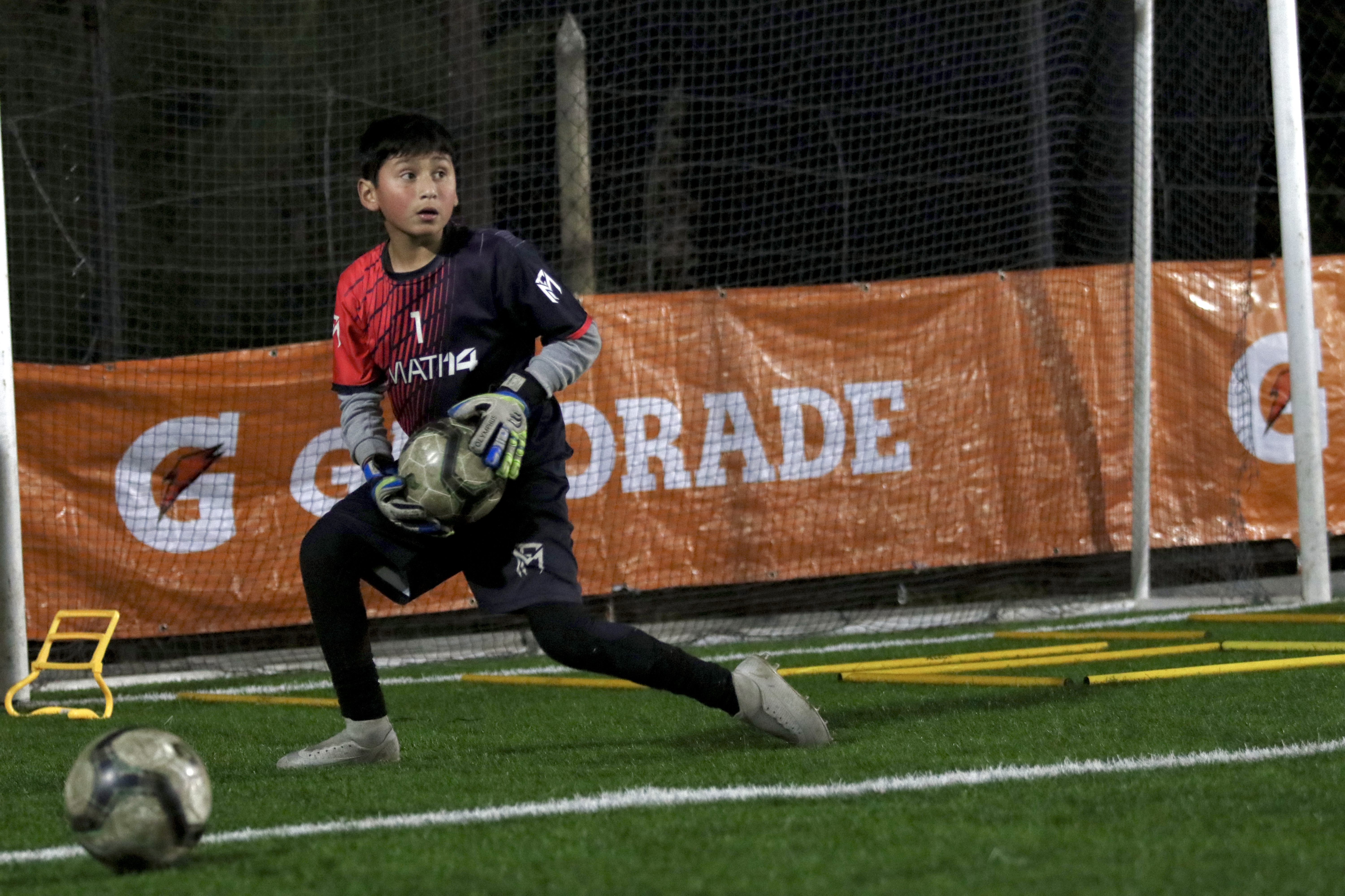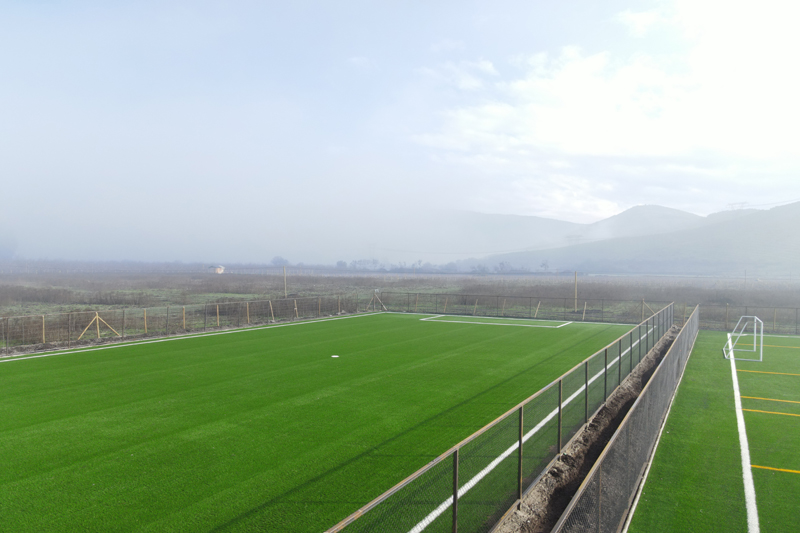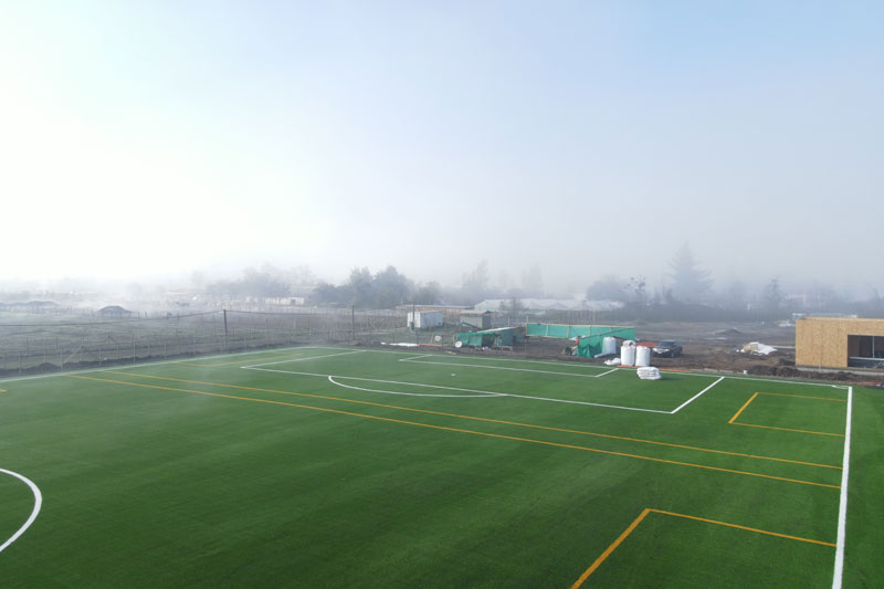 Pasto sintétetico, medidas 48 mt de largo x 28 mts de ancho para partidos de 7 jugadores por lado.